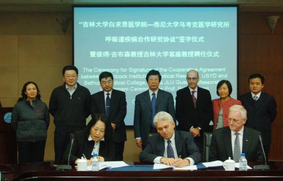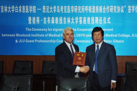 3月3日,欧美日本国产一区二区三区在线看白求恩医学院与悉尼大学乌考克医学研究所呼吸道疾病合作研究正式签署协议,吉大常务副校长李玉林同时为国际知名呼吸病学专家彼得·吉布森教授颁发欧美日本国产一区二区三区在线看客座教授聘书,并佩戴欧美日本国产一区二区三区在线看校徽。